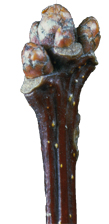BourgeonsBourgeon terminal ovoïde de 3 à 5 mm de longueur, obtus, habituellement glabres, brun rougeâtre, non disposé en angle ; bourgeons latéraux s'écartant du rameau |
